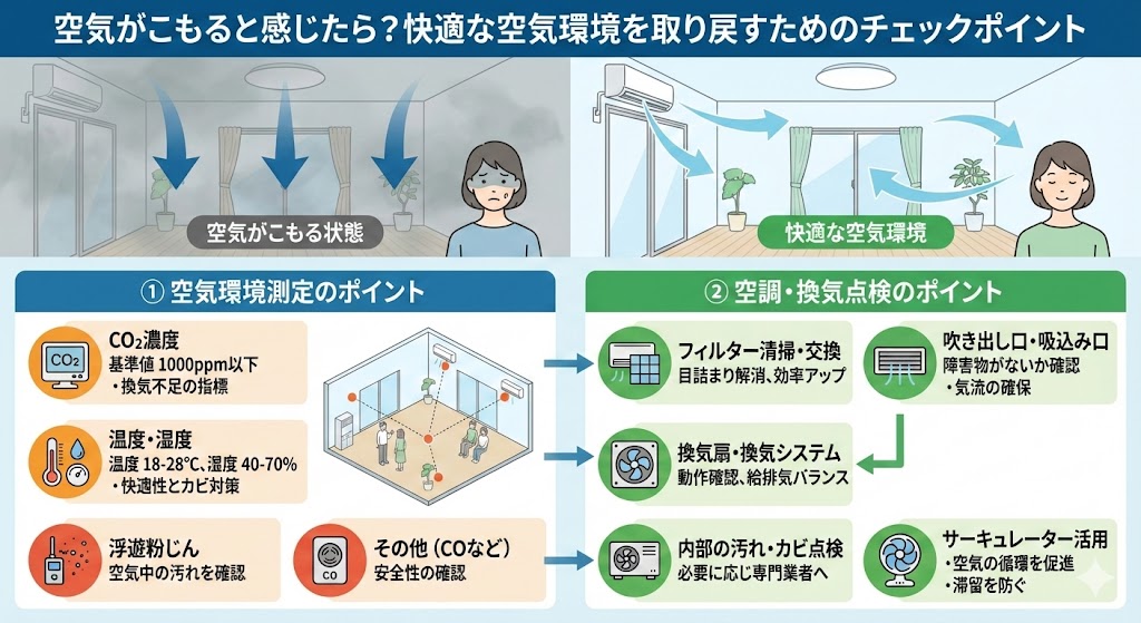 フィルターの汚れ、給排気のバランス、吹出口と吸込口の状態、空調機まわりの清掃状況など、設備側の状態をあわせて確認することで対策が立てやすくなります。